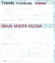 É como a nossa diva Selena Gomez, não está mais em nosso país os fãs decidiram colocar a Tag “BRAZIL MISSES SELENA”nos TT's. A tag neste momento está no TT's mundiais, a tag foi direto para a 4 colocação confira o print abaixo: